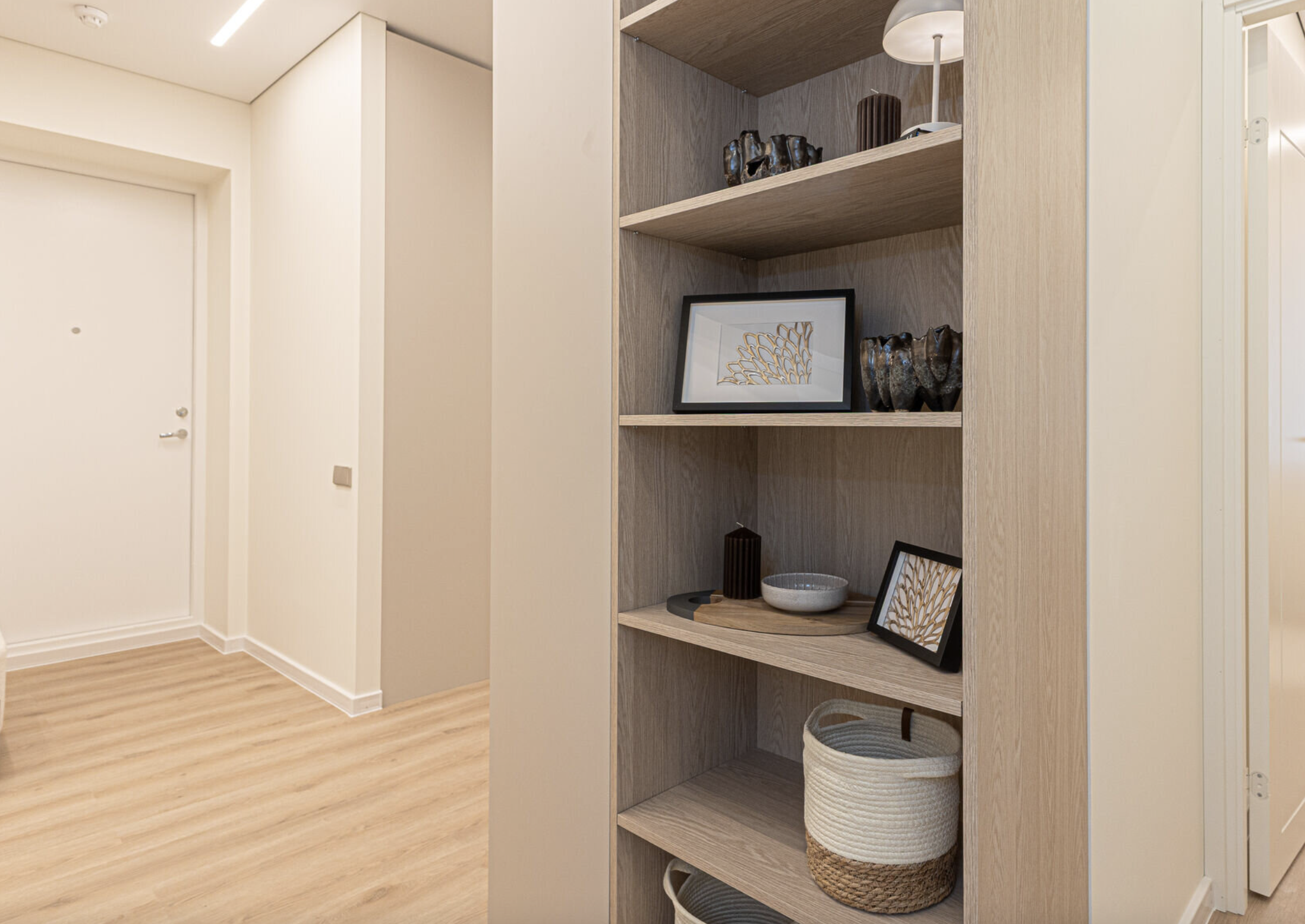 Kompaktse kodu võti on nutikates panipaikades. Seetõttu integreerisime igasse ruumi mahukad, puhaste joontega kapid, mis sulanduvad interjööri ning aitavad hoida kodu korrastatuna, kasutades maksimaalselt ära kogu olemasoleva pinna.