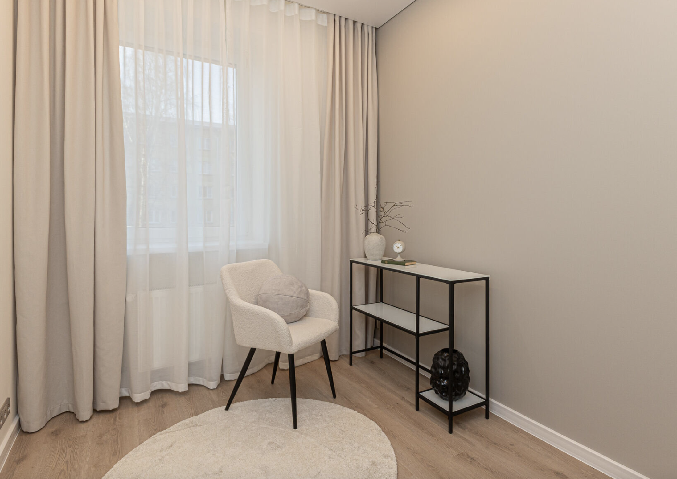 Uue lahenduse keskmes on avatud köök–elutuba, kus köök, elutuba ja esik moodustavad ühe ühtse, valgust täis eluruumi. Endise köögi arvelt lisandus korterisse üks magamistuba, mis võimaldas luua kahe väikese, kuid väga praktilise magamistoaga korteri. Nende kujundamisel lähtusime õhulisusest, tasakaalust ja skandinaavialikult rahulikust atmosfäärist.