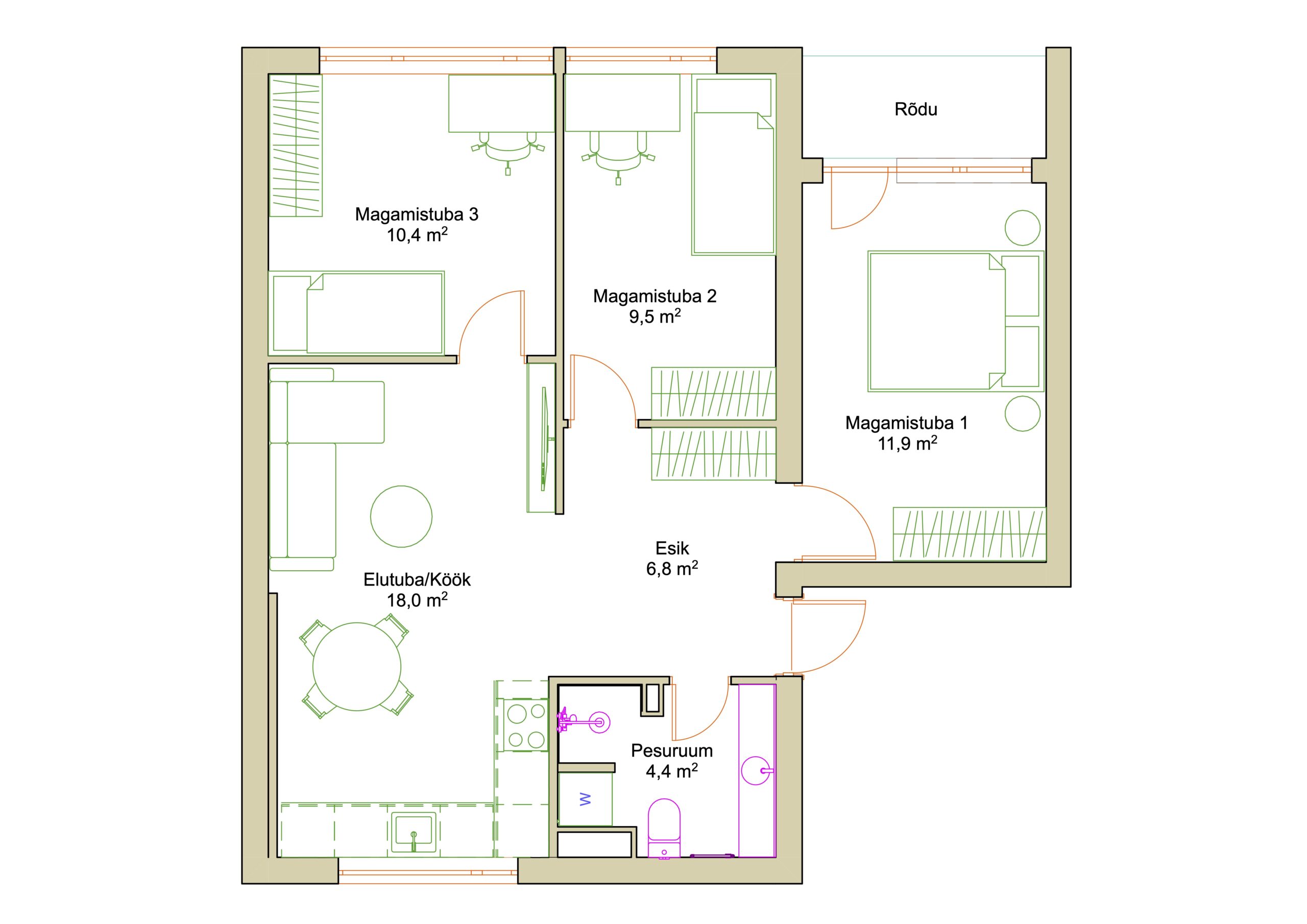 Avatud köök sulandub sujuvalt elutuppa, millest on eraldatud lisatuba. Kokku kuuluvad korteri koosseisu kolm eraldi magamistuba, avatud köögiga elutuba, esik, kaasaegne pesuruum ja rõdu.